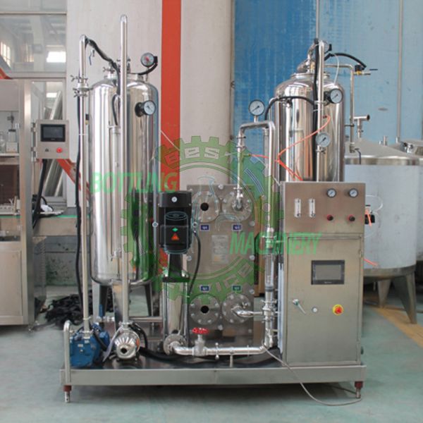 The beverage pump extracts the beverage into the degassing tank, degassing it by the vacuum pump, and then pressurizes the liquid in the degassing tank to the plate heat exchanger by the high pressure pump for cooling, and then mixes with carbon dioxide gas, and finally enters the mixing tank for processing the secondary mixing increases the mixing effect to complete the carbonated beverage.